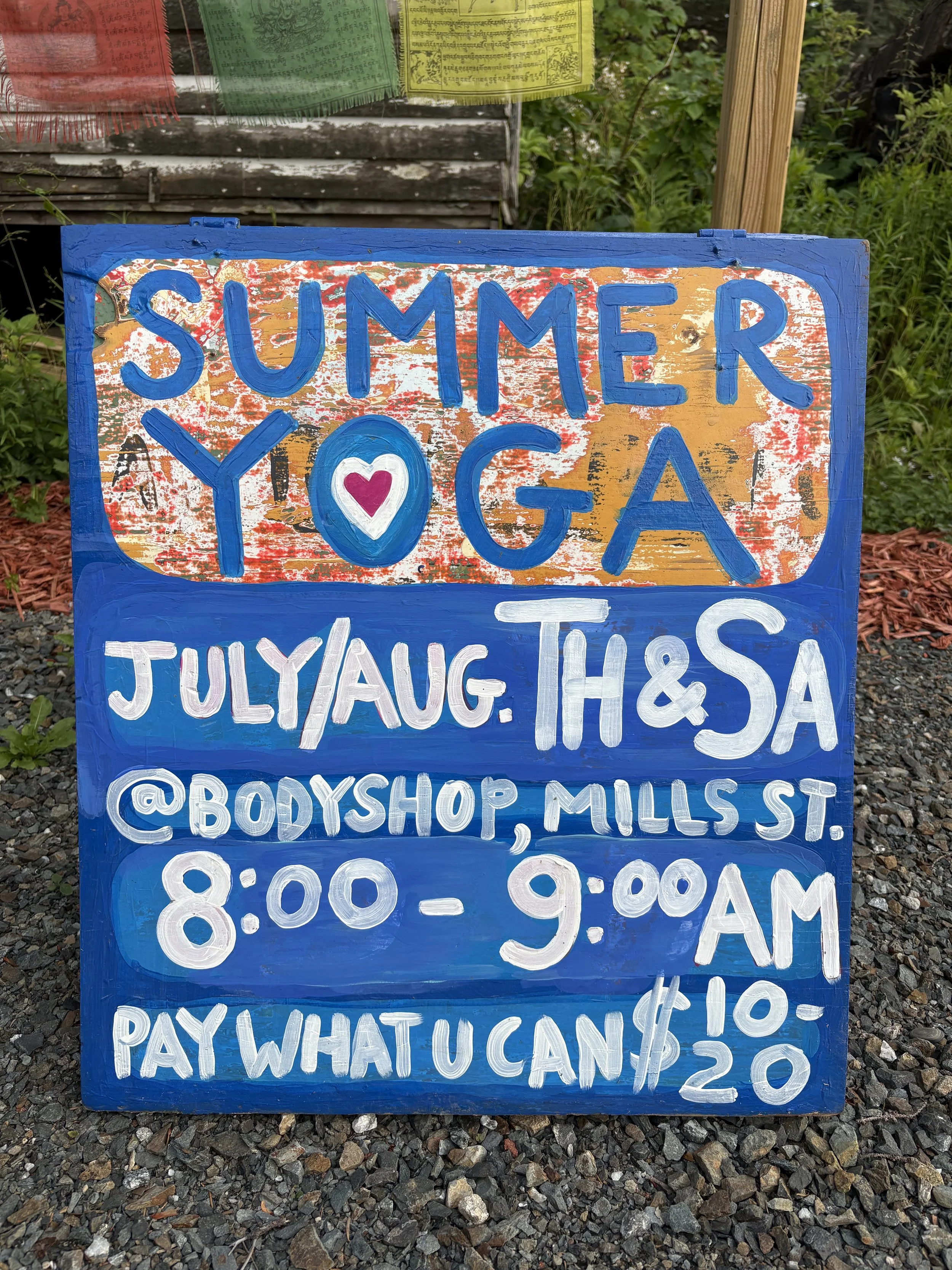 Everyone welcome! Please park in the public lot on Smith Street, or public parking downtown. Leave onsite parking open for preschool access. We’re at Nancy’s Bodyshop studio on Mills Street. East side of the street, turquoise door, interior stairs, 2nd floor, shared with Stillpoint Acupuncture. Kindly remove shoes in the entryway. Please no pets. Bring your own mat.